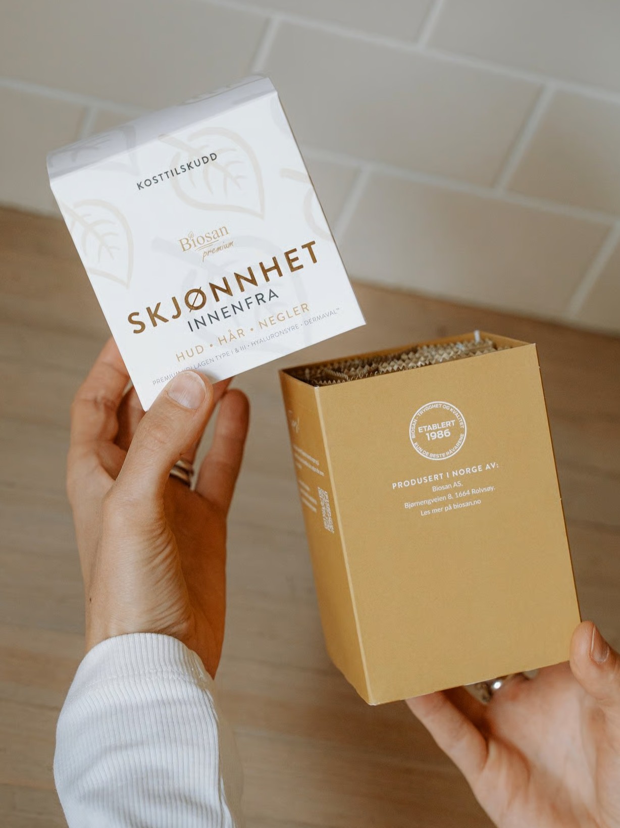 Mange av Biosans kosttilskudd er pakket inn i bærekraftig emballasje som er produsert på Skedsmokorset av Moltzau Packaging.