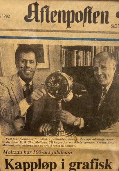 Erik Chr. Moltzau og hans far Arthur Erik Moltzau er her avbildet i Aftenposten 14. mai 1982 i anledning Moltzaus & Co.s 100-års-jubileum. Erik var 4. generasjons Moltzauer, og tok over som administrerende direktør.