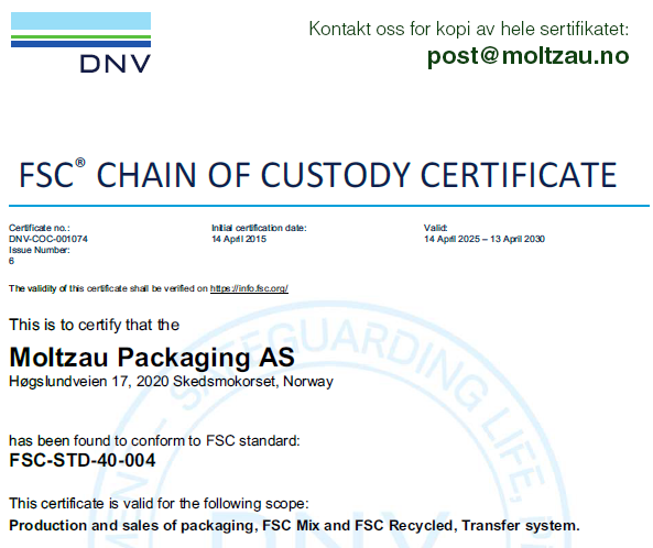 Moltzau Packaging tilbyr FSSC 22000- og EK-sertifisert fiberemballasje godkjent for matkontakt.